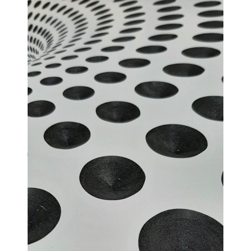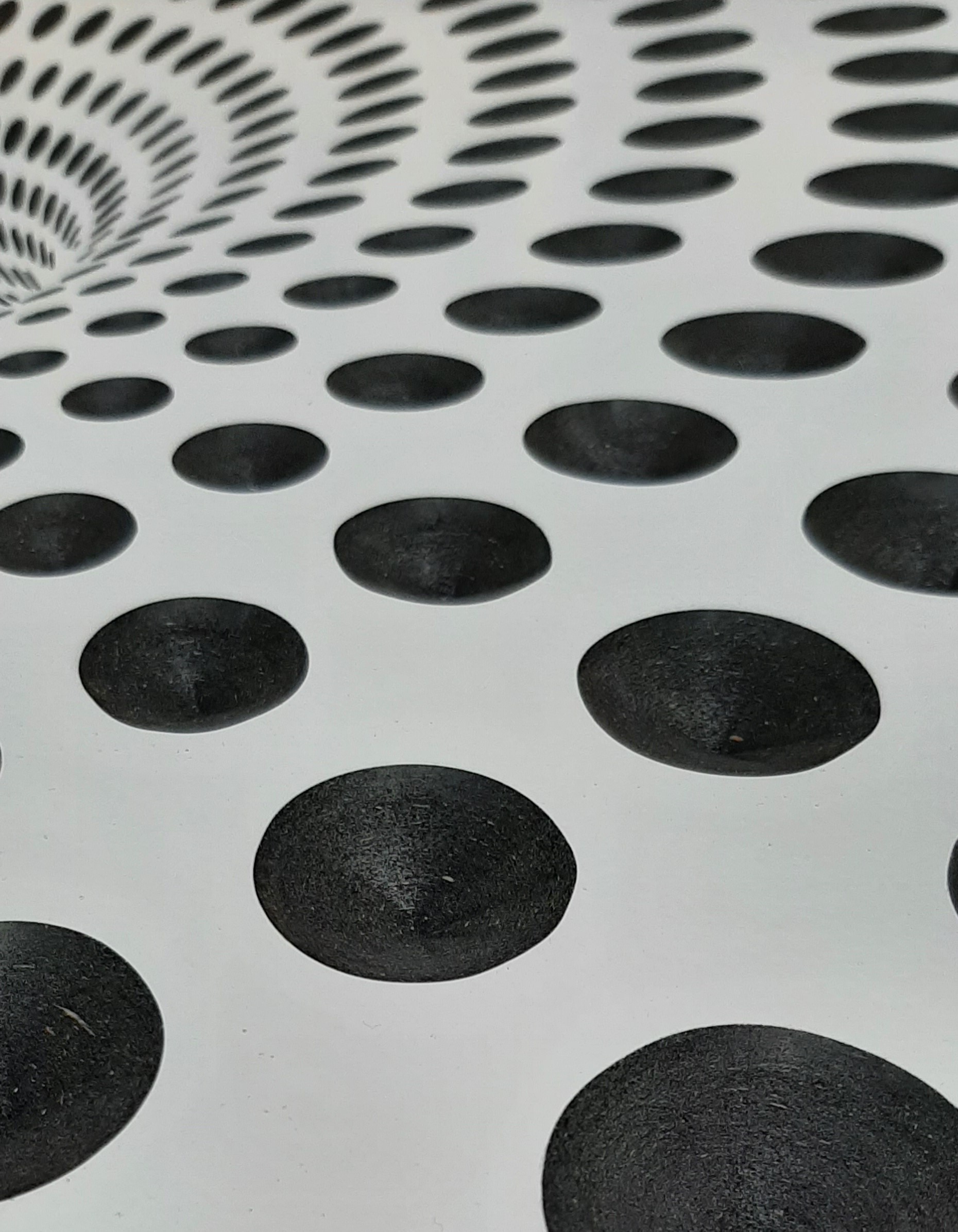 La profondeur de la gravure varie selon le diamètre des points creusés dans le bois. Cela ajoutera un jeu d'ombrage au tableau selon l'éclairage ambiant, de la lumière du jour mais aussi de l'angle d'observation.