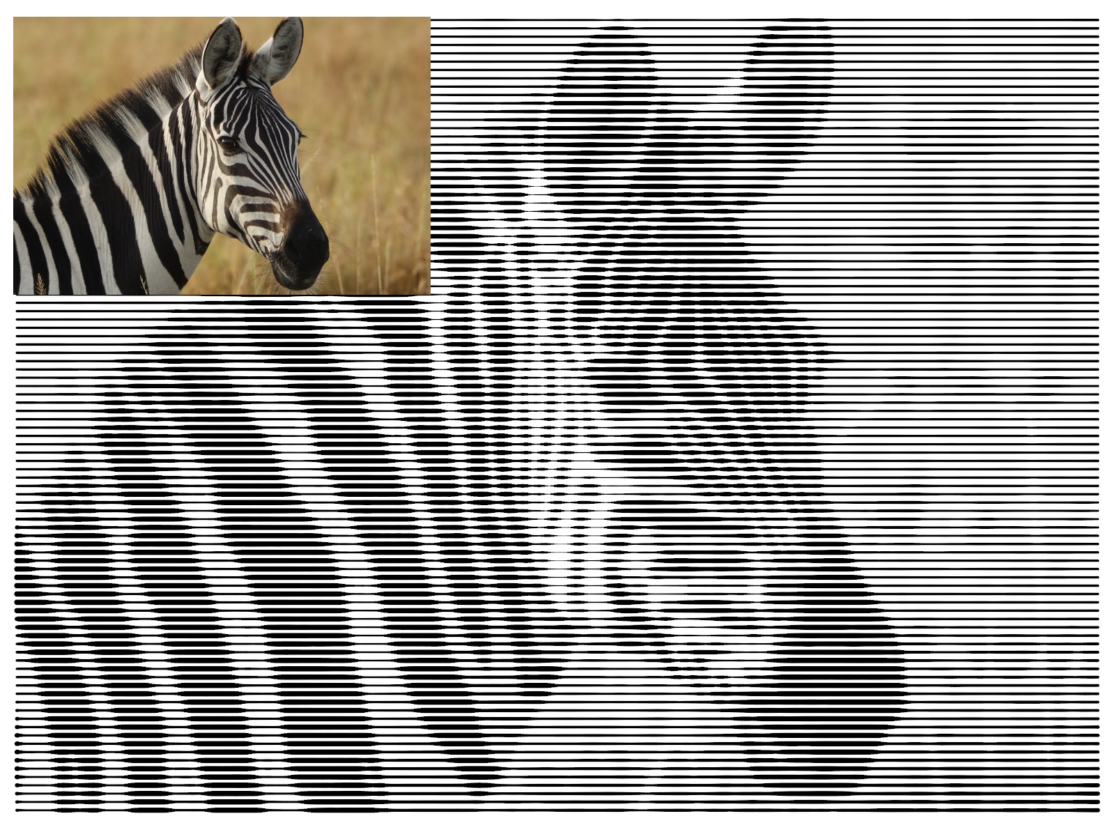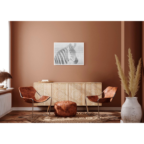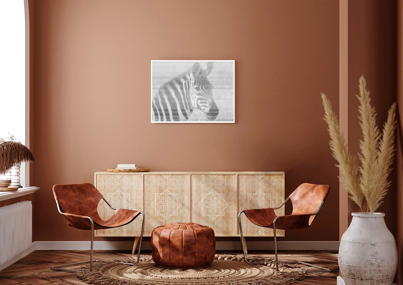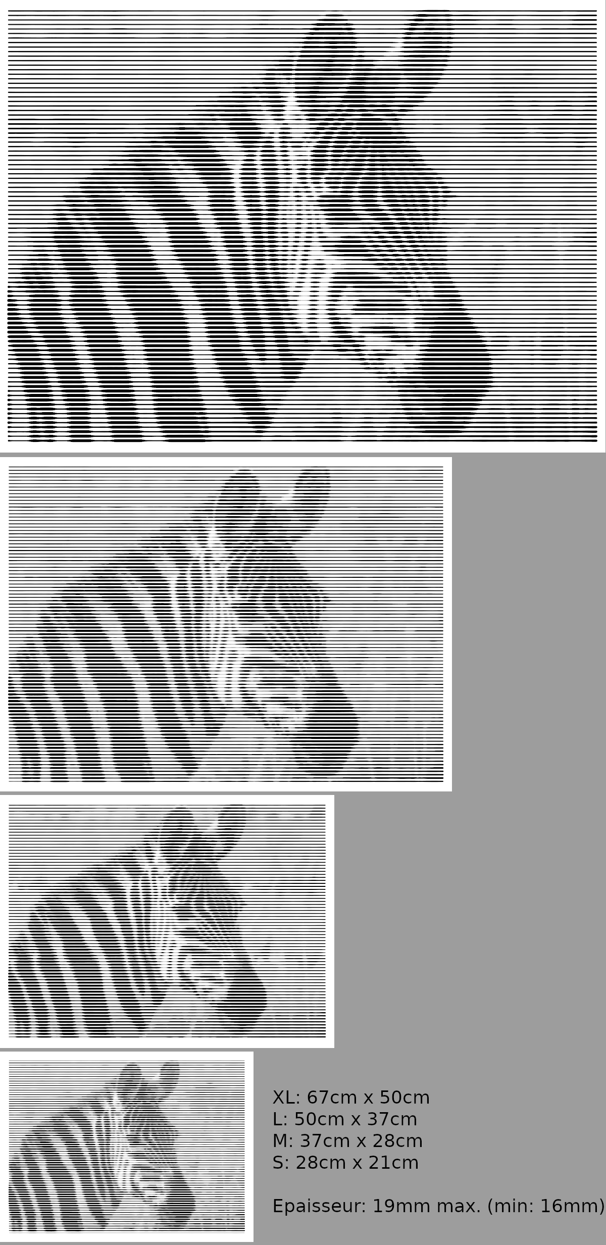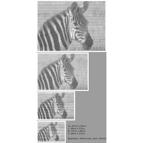 Cette gravure de photo sous forme de rayures donne un effet saisissant au tableau dont les détails apparaissent avec la distance ou l'angle de vue.