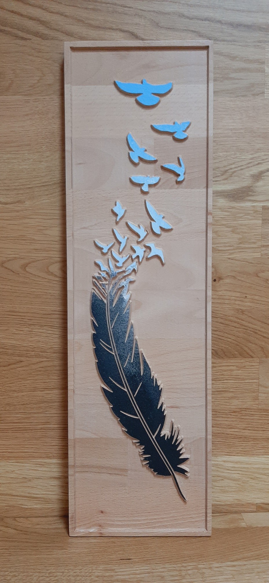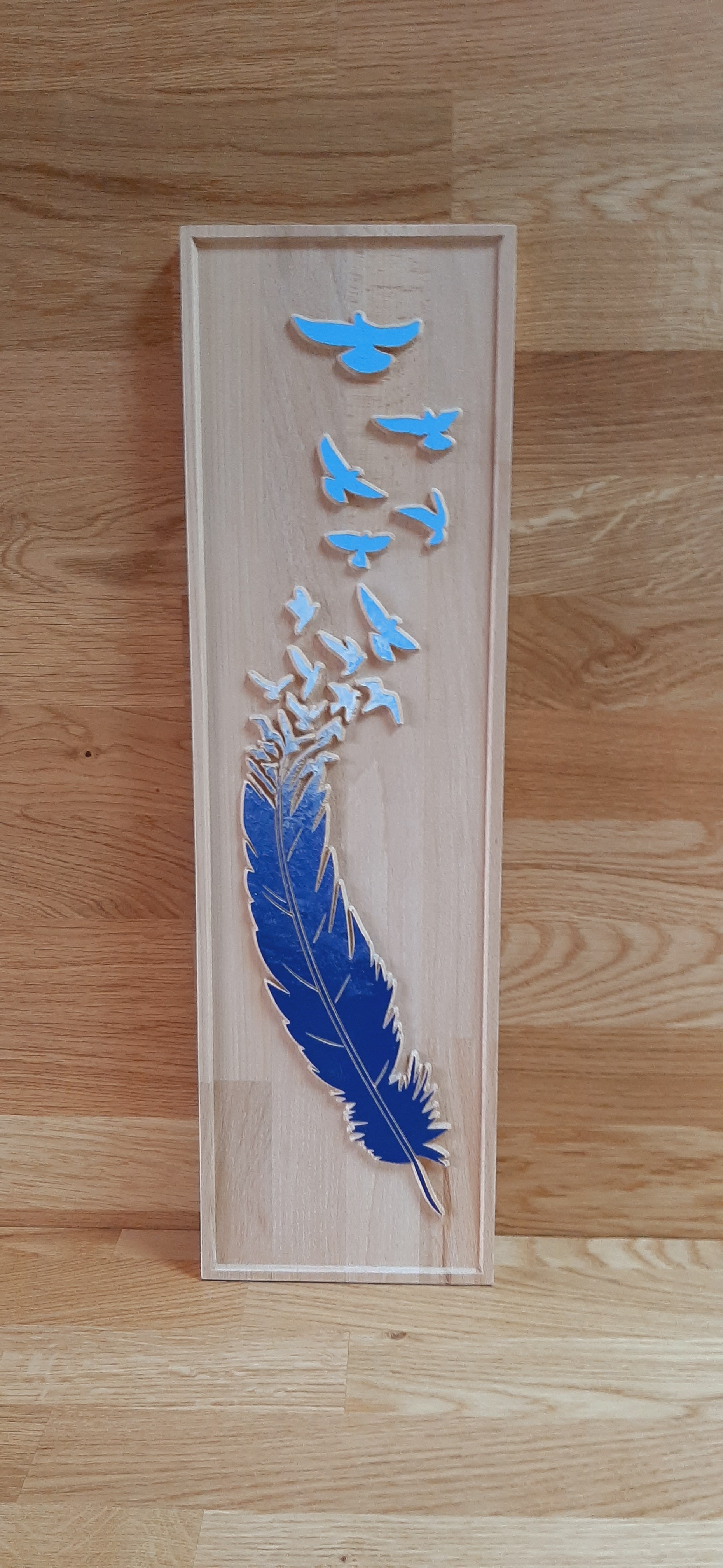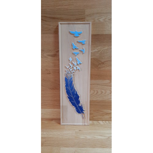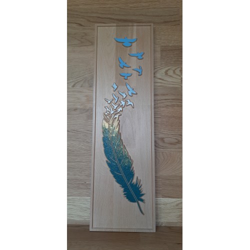 Une plume colorée gravée sur du bois de hêtre donne naissance à une envolée d'oiseaux. Poétique et harmonieuse, cette plume sera posée sur un meuble, une étagère ou pourra être accrochée au mur.