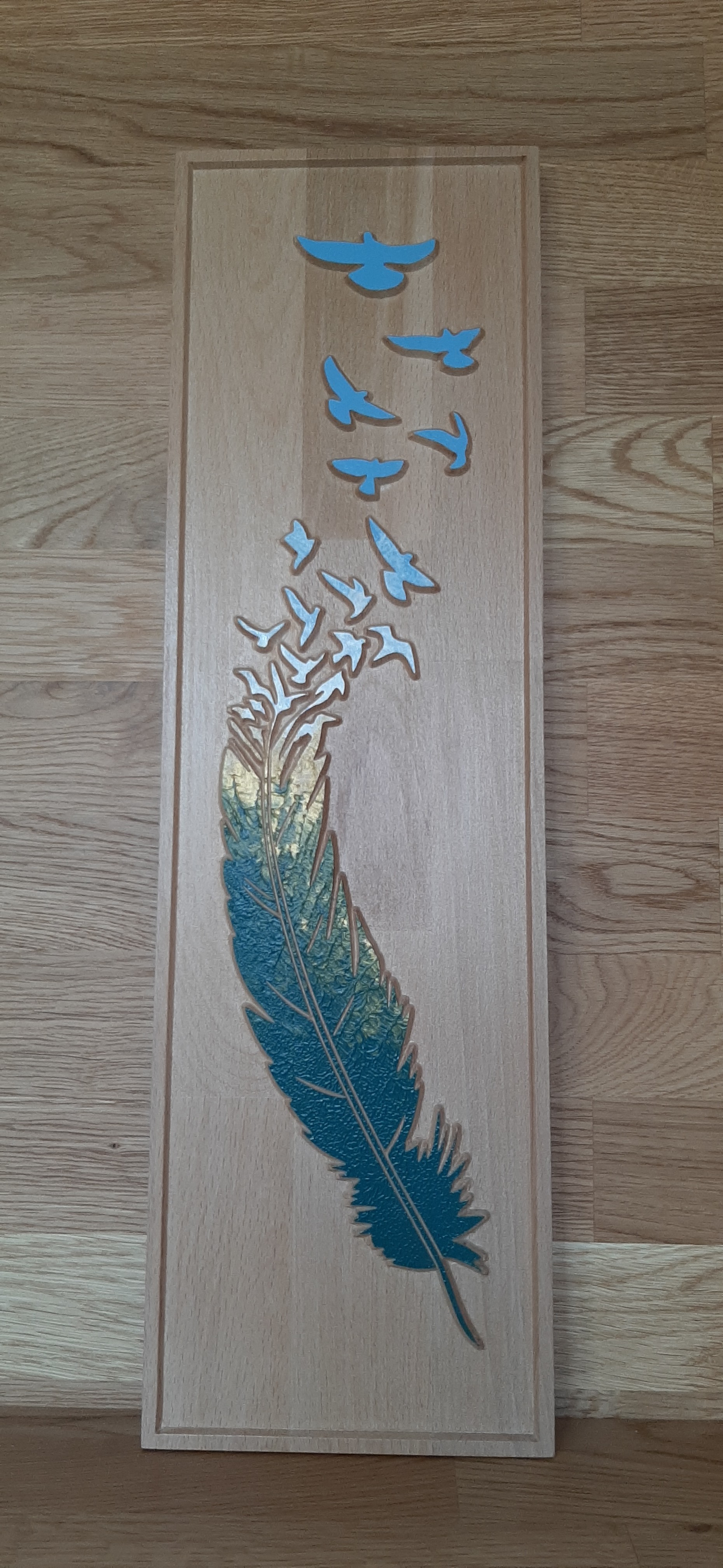 Gravure sur hêtre. Peinture acrylique au tampon : la plume pourra être noire, bleue nuit, verte. Les vexilles supérieurs de la plume se transforment dans un nuage argenté ou doré puis blanc. Les oiseaux s'envolent dans un ciel bleu d'été.