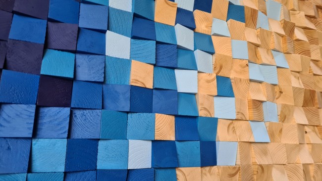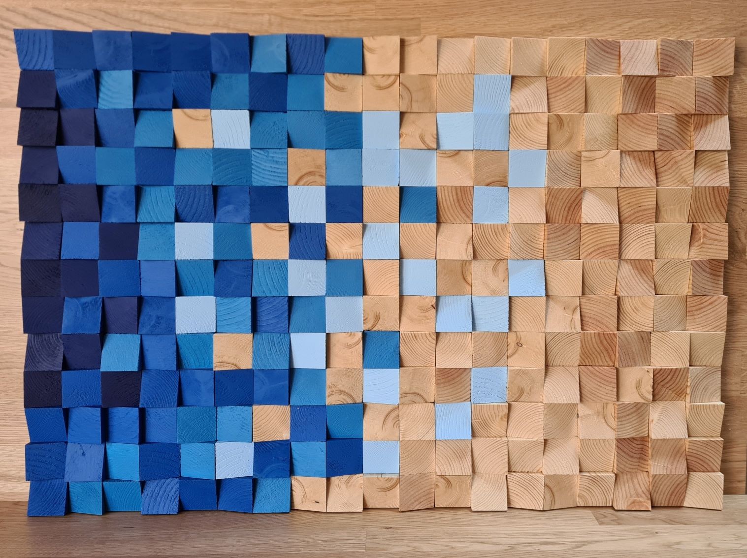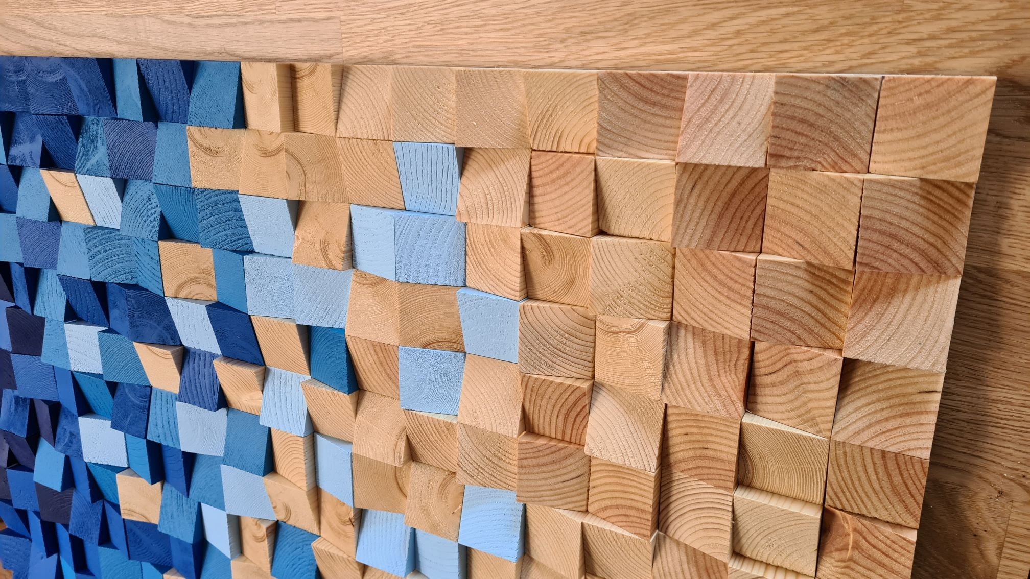 Mosaïque de pèces de pin, biseautées, poncées et peintes manuellement et formant une image abstraite, jouant avec la lumière ambiante.